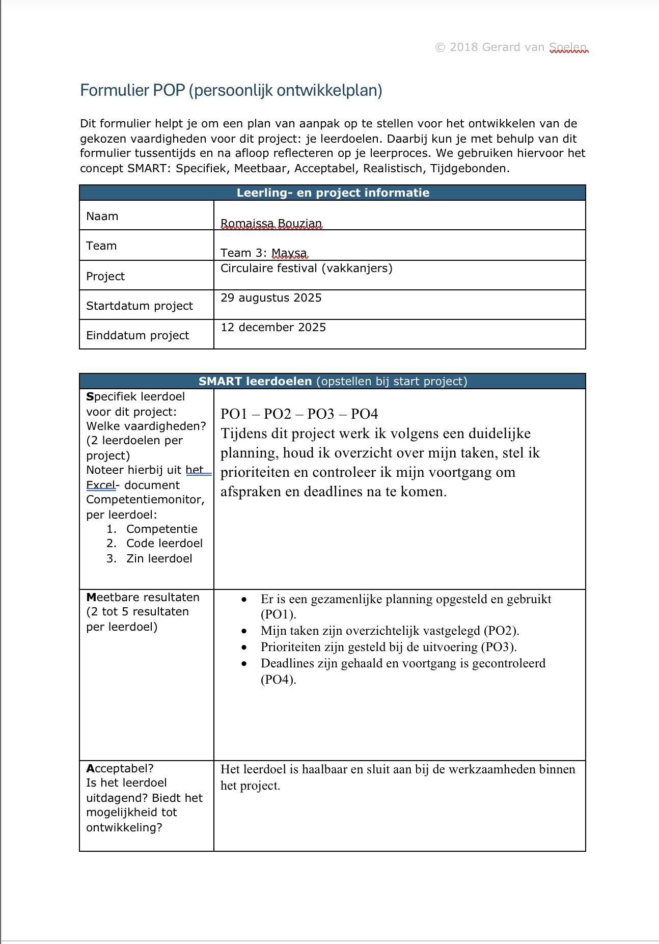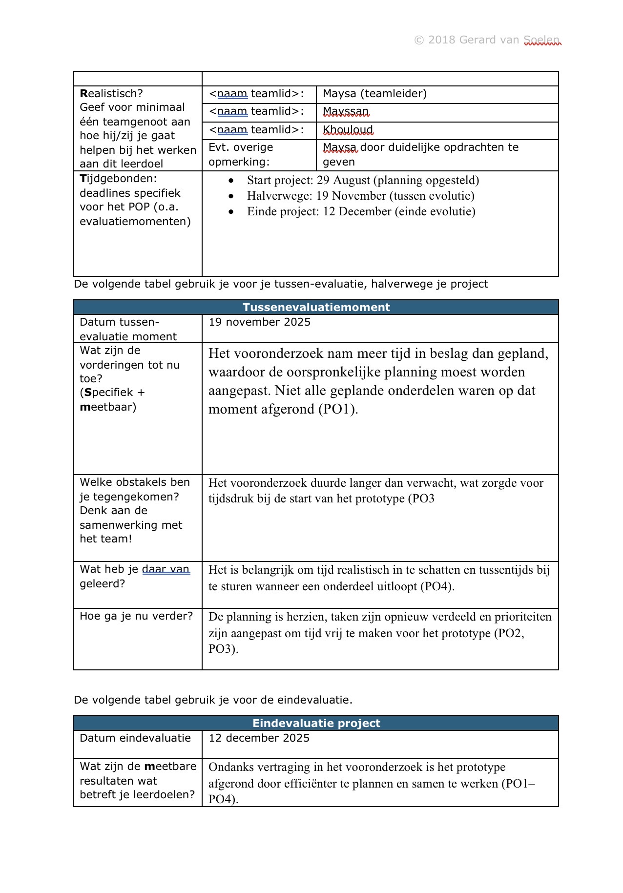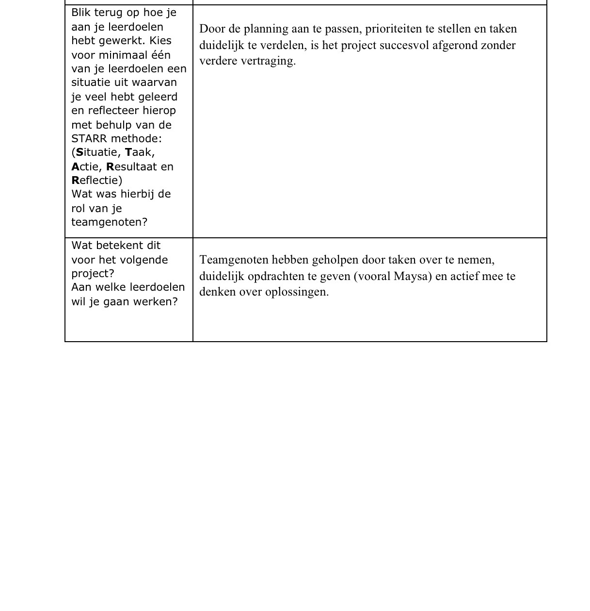Tot nu toe vind ik dat ik mijn leerdoelen goed toepas in dit project. De samenwerking verloopt prettig en iedereen houdt zich aan de planning. De verdeling van de taken is eerlijk en ik merk dat we op schema liggen. Door beter vooruit te plannen, heb ik minder stress en meer overzicht over wat er nog moet gebeuren.